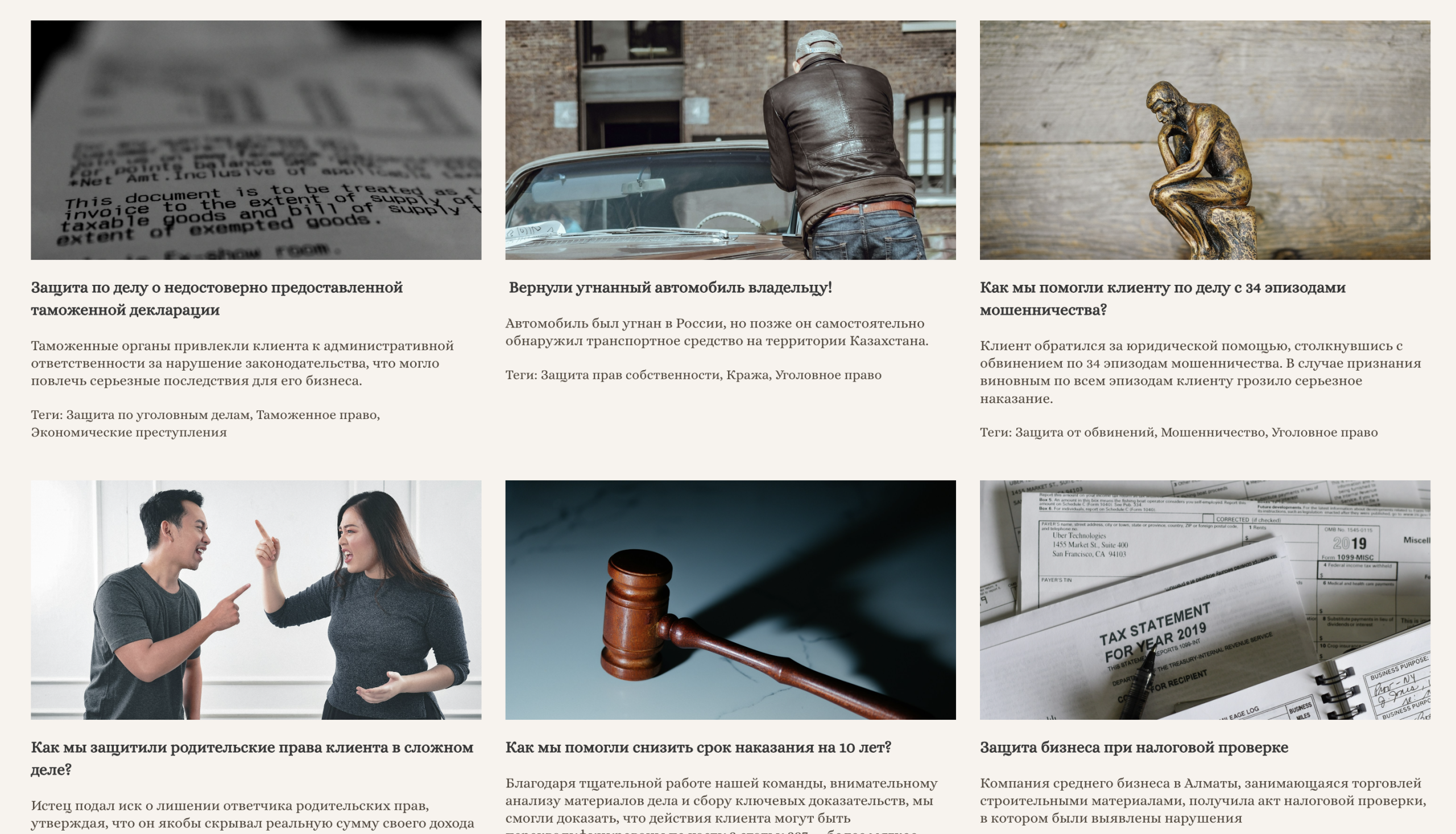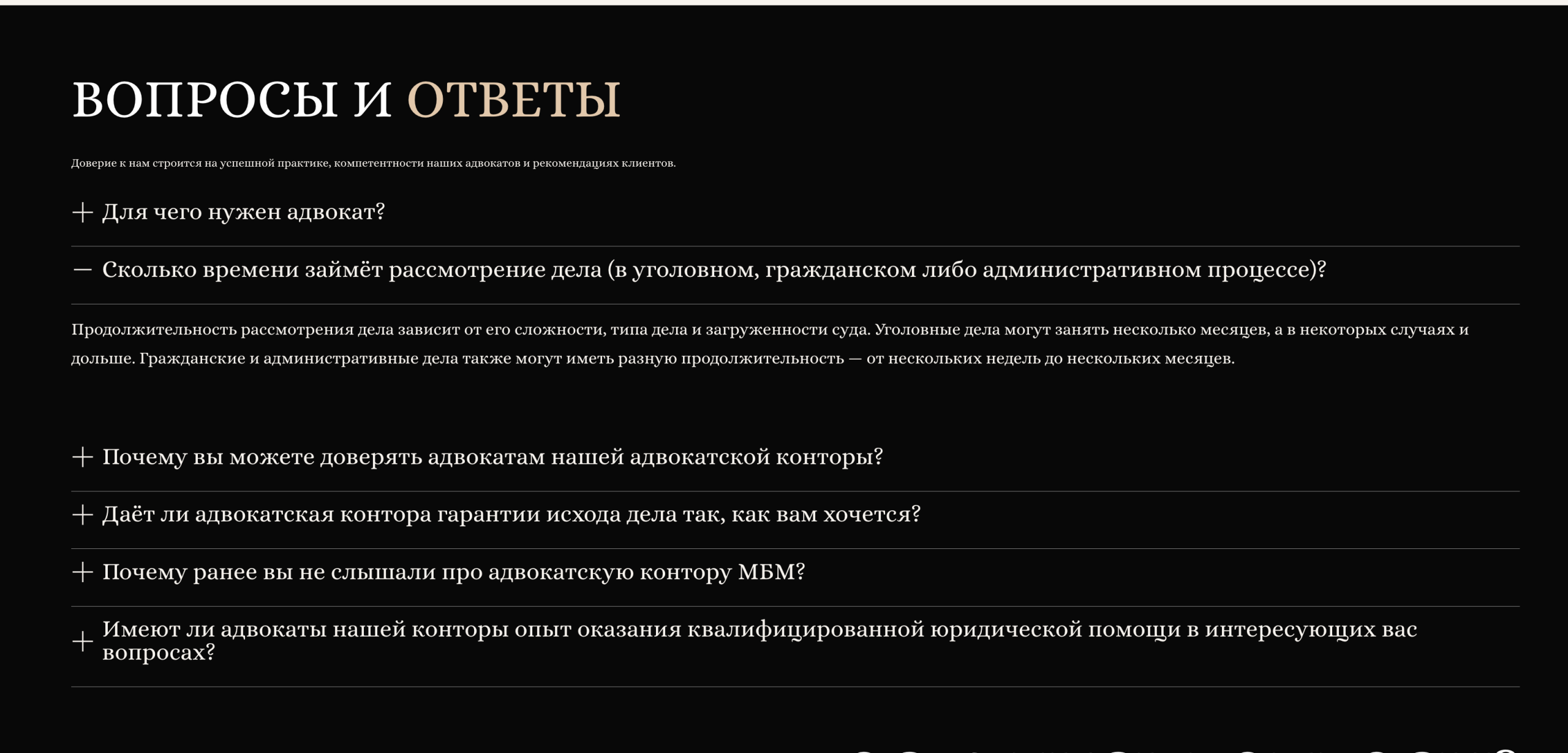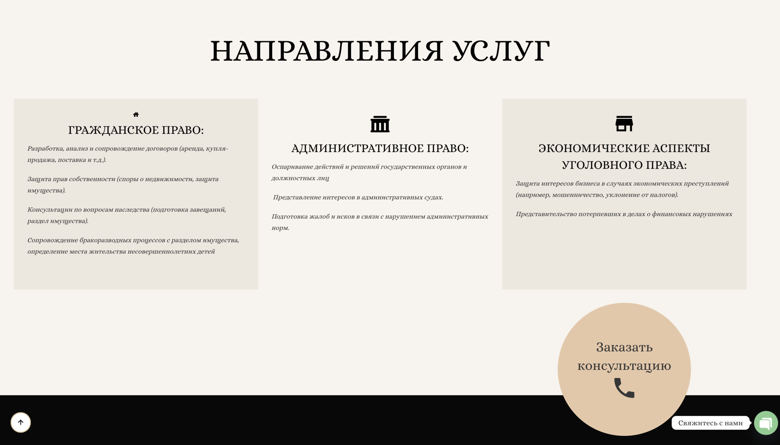 Удобная навигация по услугам с возможностью детального ознакомления с каждой областью права.