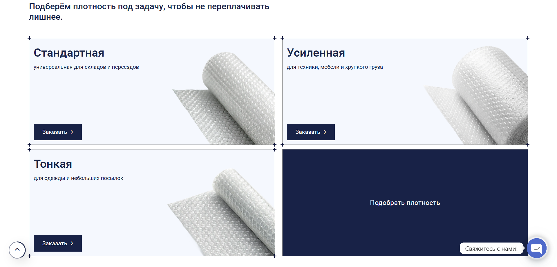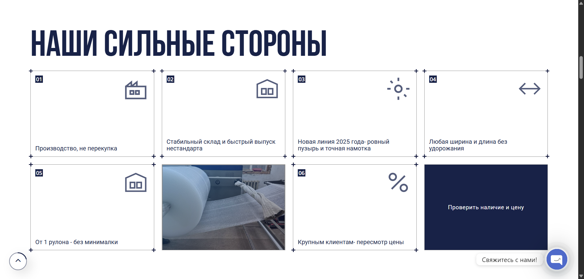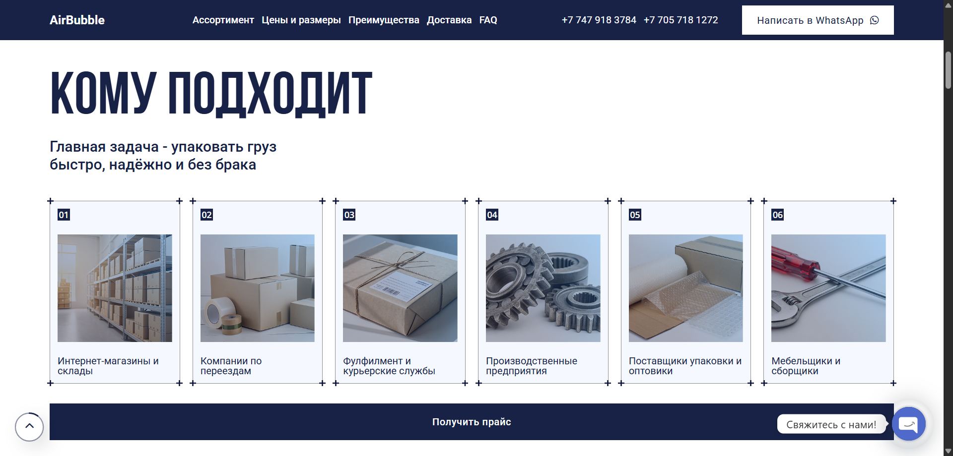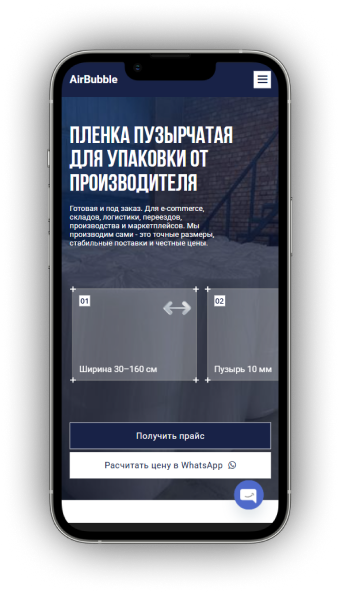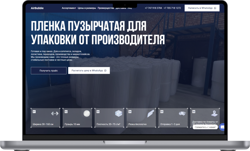 Создать современный сайт-каталог для компании AirBubble, занимающейся производством пузырчатой упаковочной плёнки, который наглядно показывает ассортимент, характеристики продукции и упрощает запрос прайса и связь с менеджером.