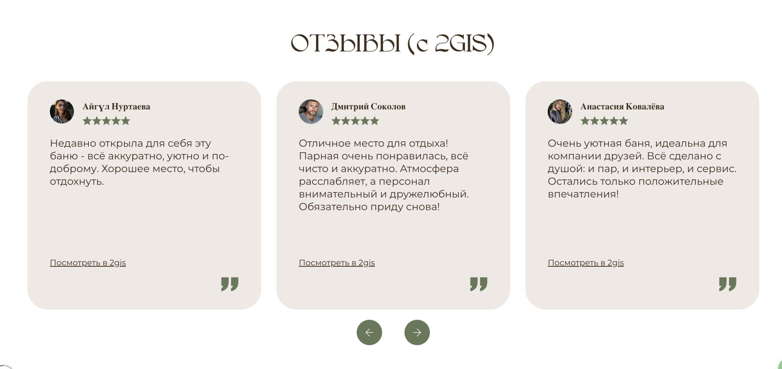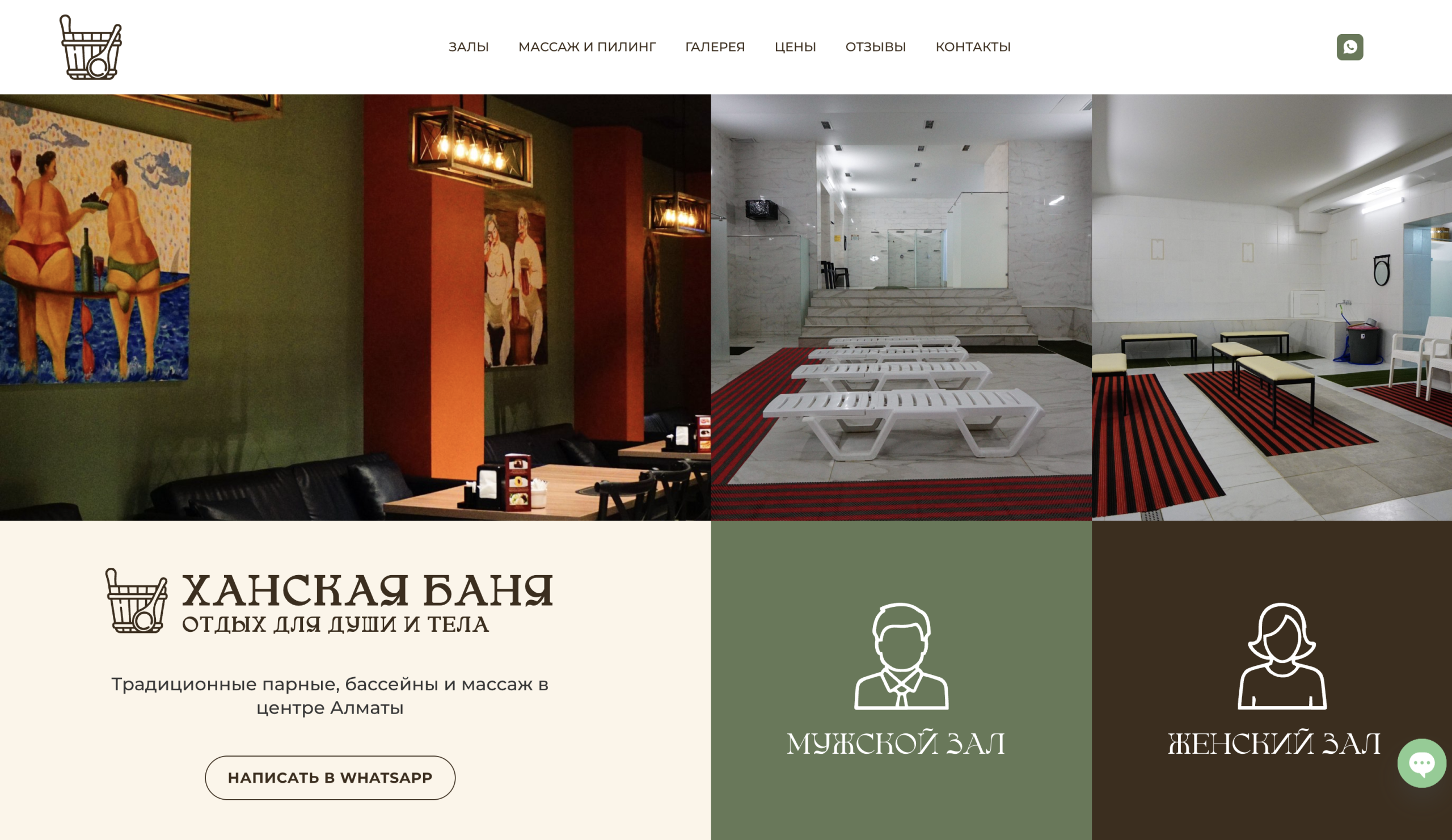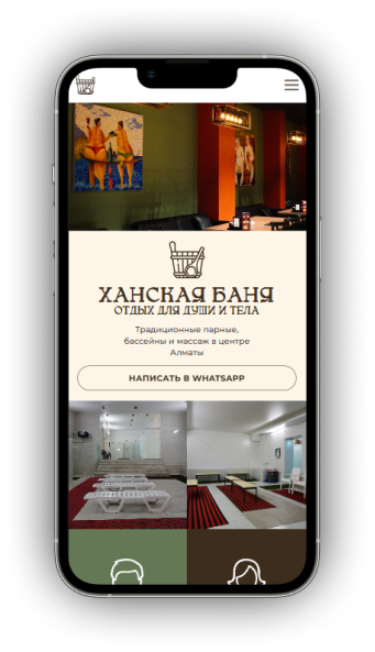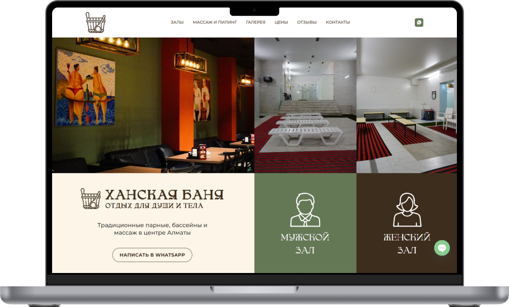 Создать лендинг для Ханской Бани — комплекса бань и зон отдыха. Цель — передать атмосферу заведения, показать преимущества, услуги, интерьер и удобства, а также обеспечить простой способ записи. Важно было подчеркнуть уровень сервиса и визуально погрузить пользователя в атмосферу отдыха.