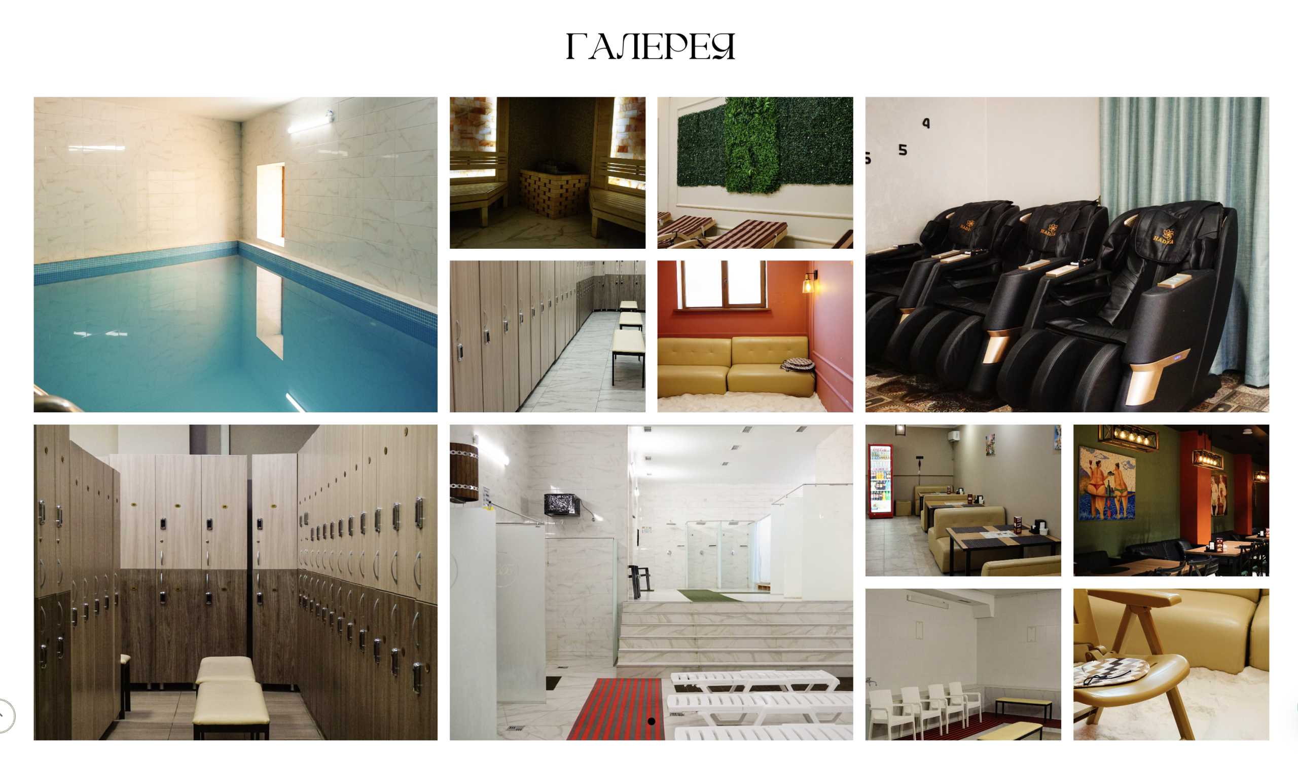 Разработан современный и стильный лендинг в Figma с упором на визуальный контент: интерьер, парные, зоны отдыха и услуги. Использован чистый, премиальный стиль с акцентом на фотографиях и понятной структурой.