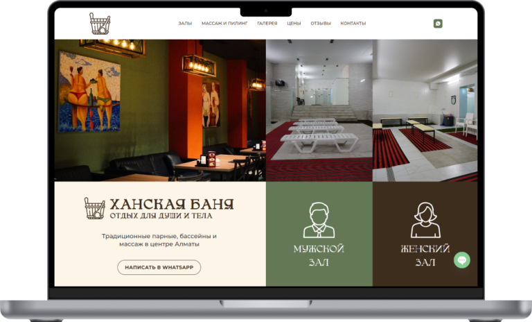 Создать лендинг для Ханской Бани — комплекса бань и зон отдыха. Цель — передать атмосферу заведения, показать преимущества, услуги, интерьер и удобства, а также обеспечить простой способ записи. Важно было подчеркнуть уровень сервиса и визуально погрузить пользователя в атмосферу отдыха.