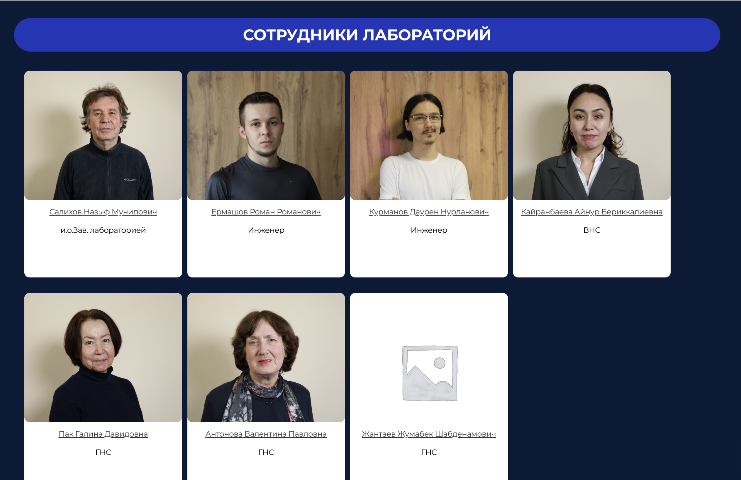 • Главная страница с общей информацией о институте, а также динамическими разделами для лабораторий, сотрудников и проектов.