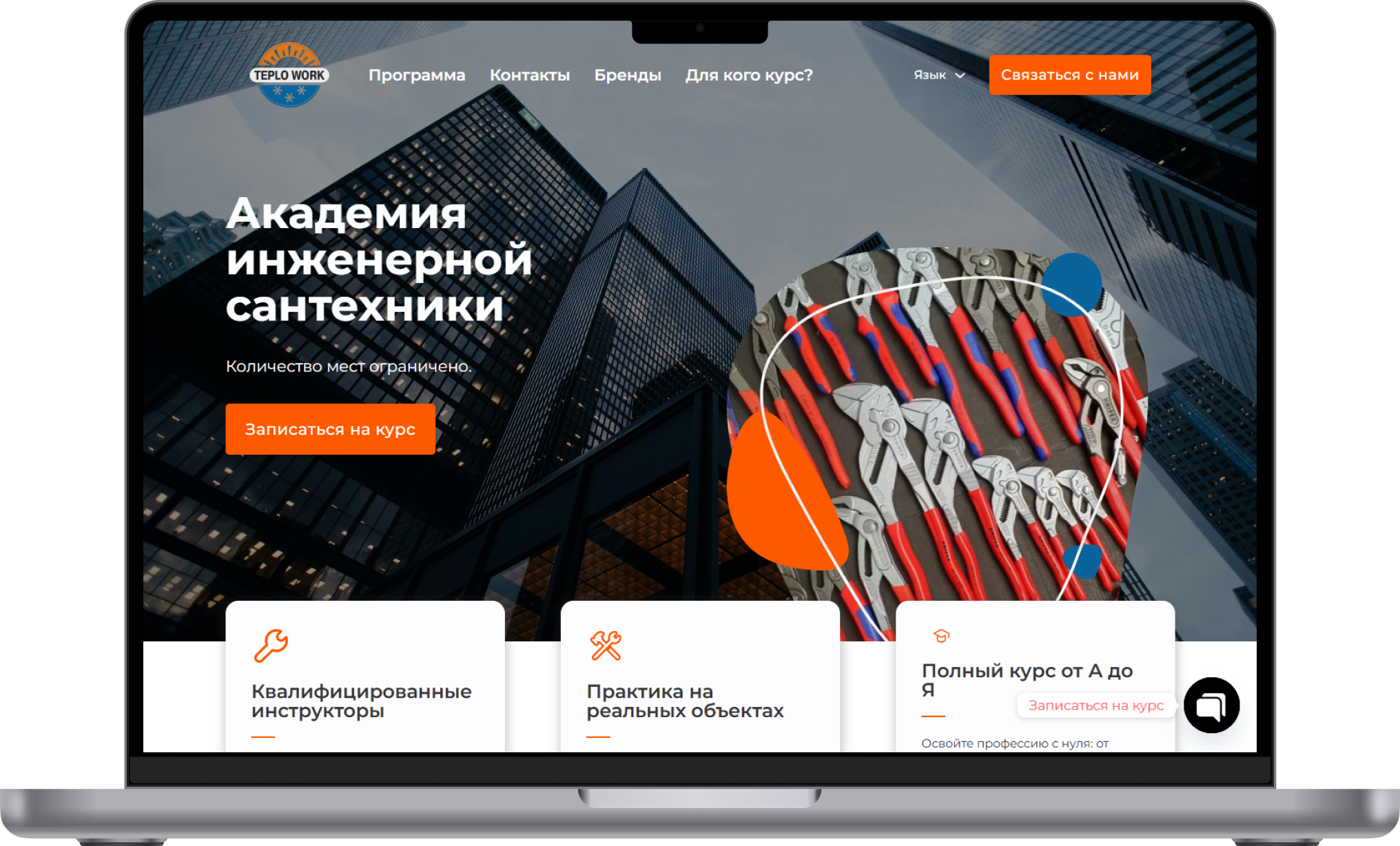 Создать многоязычный лендинг для Академии инженерной сантехники TEPLOWORK, который просто и доходчиво объясняет ценность обучения, демонстрирует программу курса, инструкторов и выгоды для разных категорий слушателей. Важная цель — сделать удобную систему записи на курс и повысить конверсию через грамотную структуру и визуал.