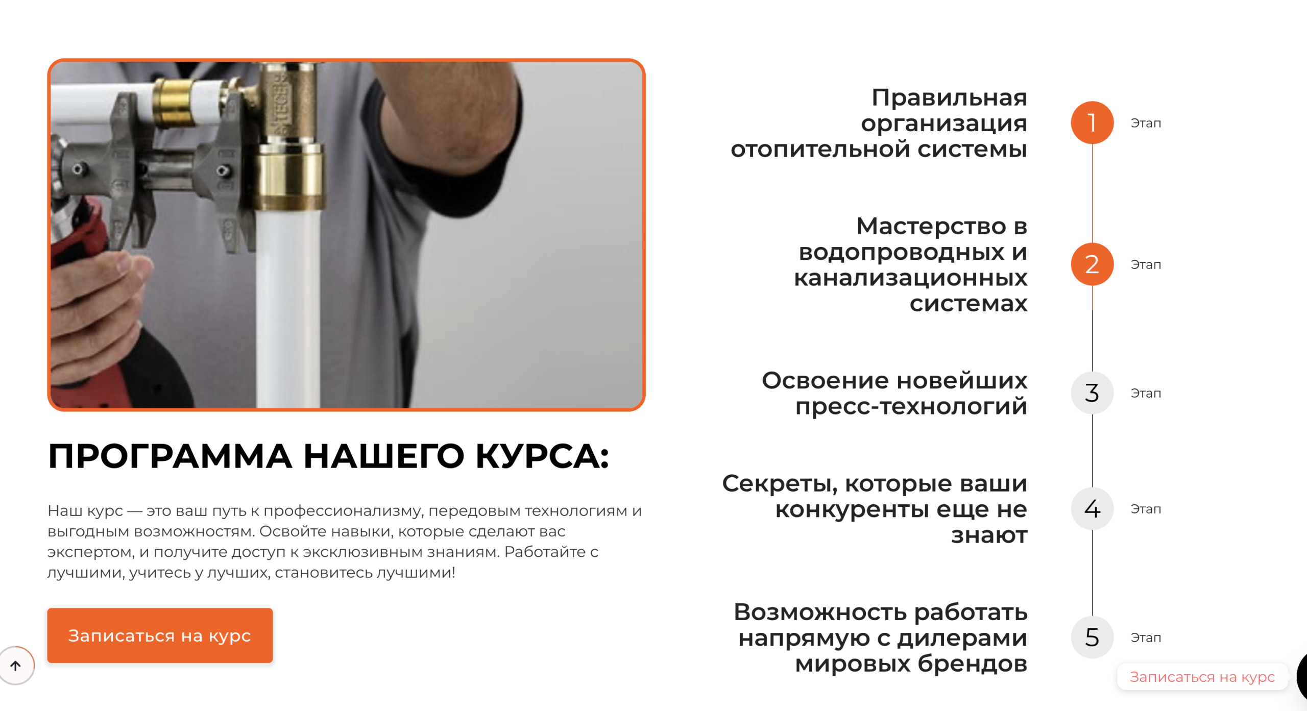 Проработали блоки для разных аудиторий (специалисты, предприниматели, домовладельцы), добавили программу курса по этапам и интегрировали удобные формы записи.