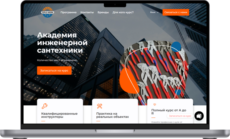 Создать многоязычный лендинг для Академии инженерной сантехники TEPLOWORK, который просто и доходчиво объясняет ценность обучения, демонстрирует программу курса, инструкторов и выгоды для разных категорий слушателей. Важная цель — сделать удобную систему записи на курс и повысить конверсию через грамотную структуру и визуал.