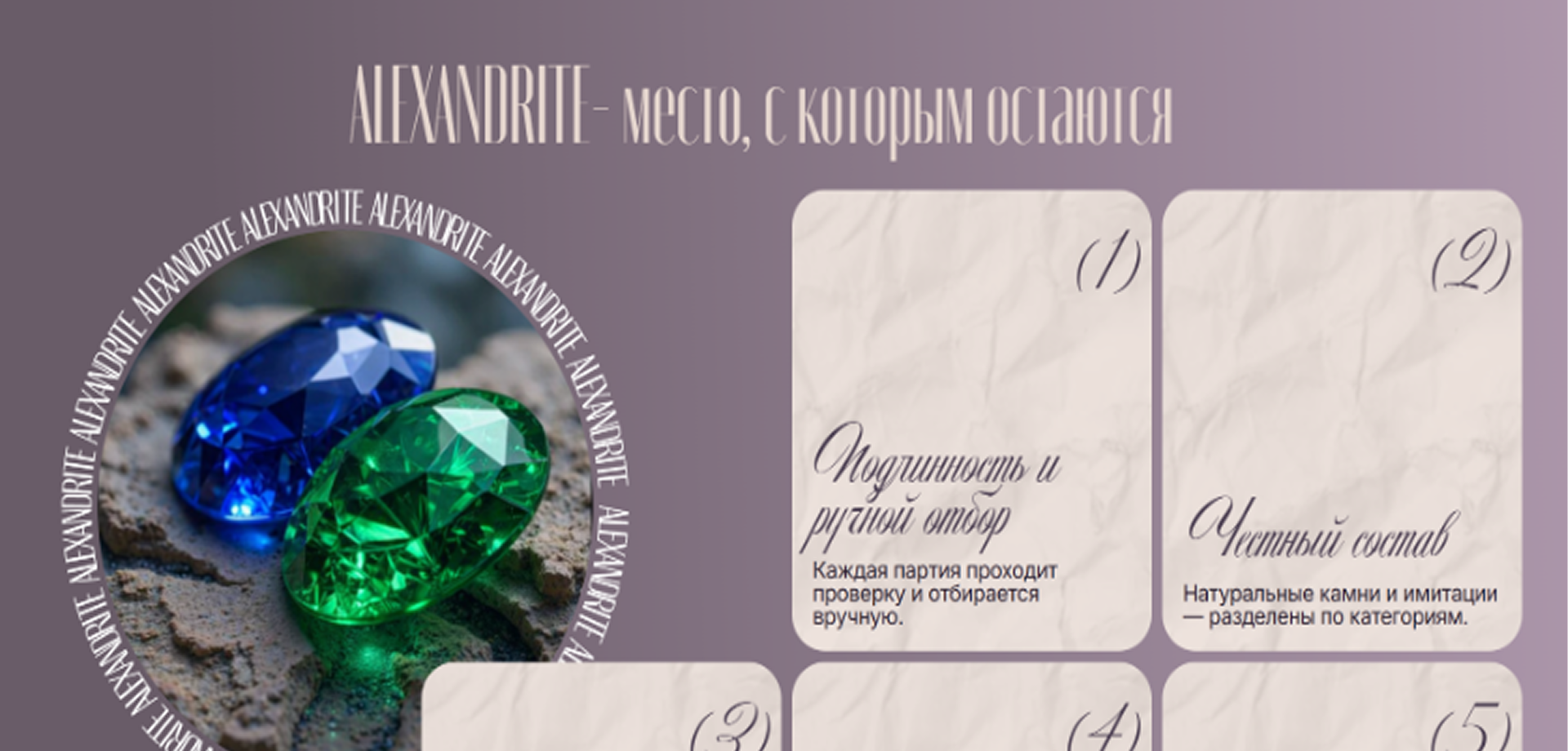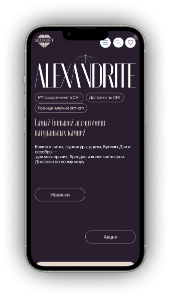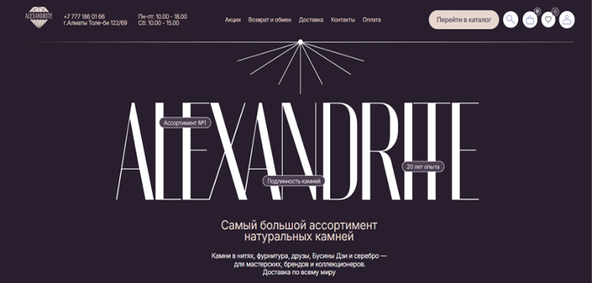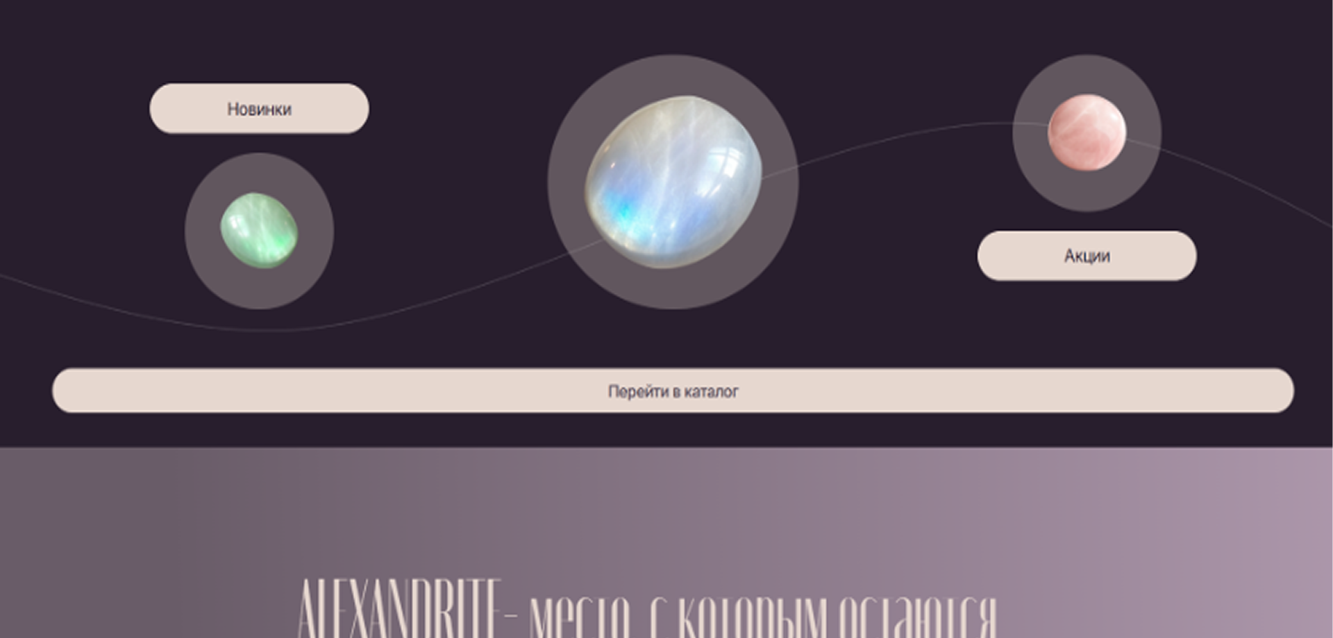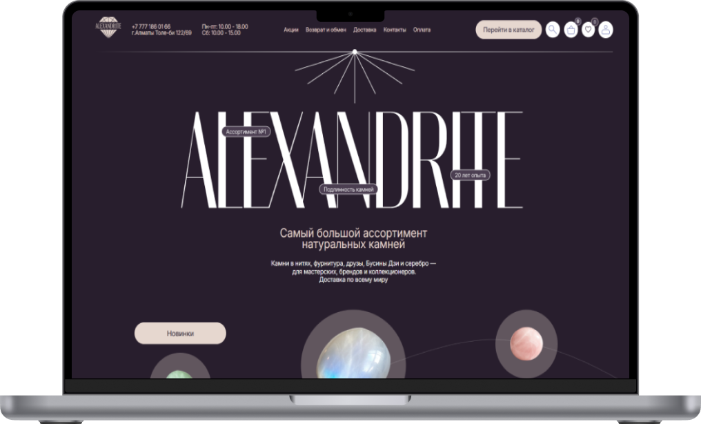 Создать сайт для компании Alexandrite.pro, предлагающей широкий ассортимент натуральных камней, включая камни в нитях, фурнитуру, друзы, бусины Дзи и серебро для мастерских, брендов и коллекционеров. Особое внимание уделено глобальной доставке и удобной навигации по продукции.