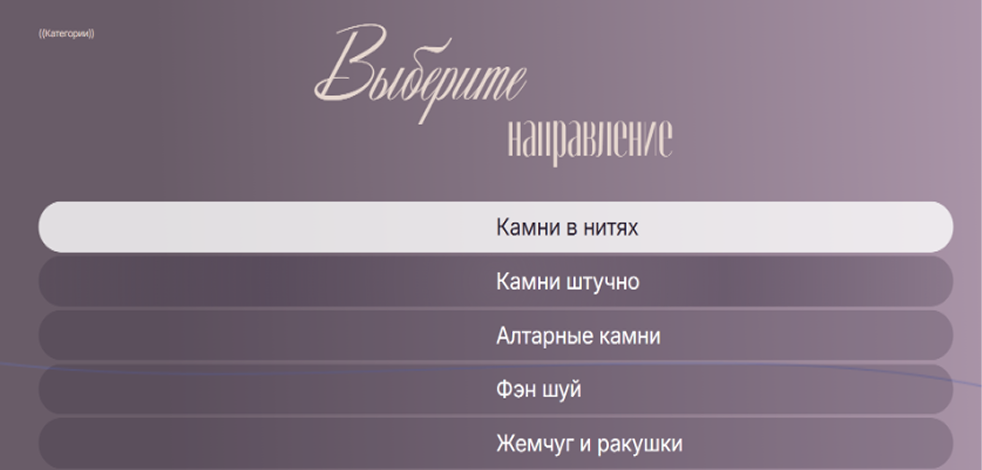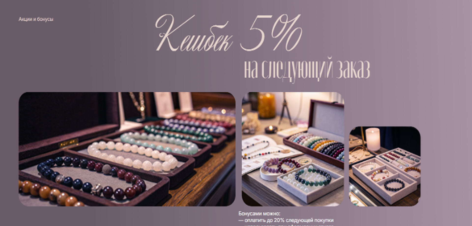 — Информационные блоки с описанием продукции (камни, фурнитура, бусины, серебро).